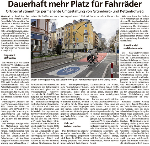 Dem folgt der Ortsbeirat mit zwei Vorlagen von Grünen und SPD, denen die Linke zustimmt. CDU, FDP und BFF votieren gegen die Umsetzung im Grüneburgweg. Den Radweg im Kettenhofweg lehnt nur die CDU ab; FDP und BFF enthielten sich.