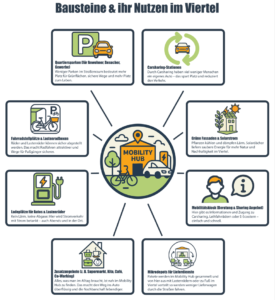 Im Wohnumfeld entstehen modulare Mobilitäthäuser (Mobility Hubs) mit Fokus auf Fuß, Rad und Sharing – kombiniert mit Nutzungen für das Viertel: Repair-Werkstatt, Vereins- und Cowork-Räume, Kita oder Kultur – je nach Lage. Wichtig ist die Reversibilität: Was heute Mobilität strukturiert, kann morgen soziale Infrastruktur aufnehmen. So bleiben die Gebäude über ihren Lebenszyklus nützlich – auch wenn sich Mobilität weiter verändert.