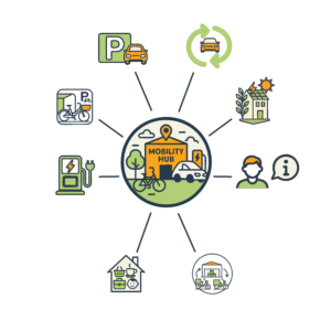 Im Wohnumfeld entstehen modulare Mobilitäthäuser (Mobility Hubs) mit Fokus auf Fuß, Rad und Sharing – kombiniert mit Nutzungen für das Viertel: Repair-Werkstatt, Vereins- und Cowork-Räume, Kita oder Kultur – je nach Lage. Wichtig ist die Reversibilität: Was heute Mobilität strukturiert, kann morgen soziale Infrastruktur aufnehmen. So bleiben die Gebäude über ihren Lebenszyklus nützlich – auch wenn sich Mobilität weiter verändert.