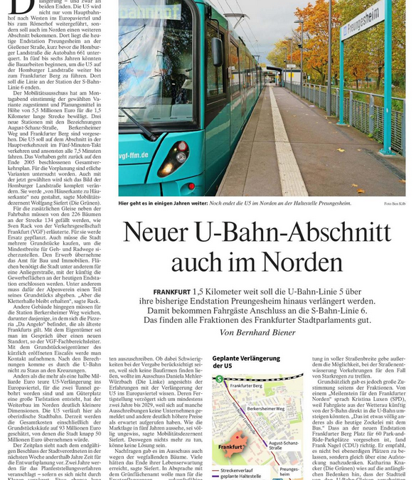 Frankfurt 1,5 Kilometer weit soll die U-Bahn-Linie 5 über ihre bisherige Endstation Preungesheim hinaus verlängert werden. Damit bekommen Fahrgäste Anschluss an die S-Bahn-Linie 6. Das finden alle Fraktionen des Frankfurter Stadtparlaments gut.